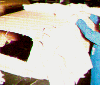 glues and hand sews the woolcloth lining, layers of wadding and fire-resistant