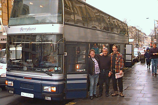 Suzanne's tour bus, the two bus drivers on the left, and John Gallagher, long-time monitor engineer