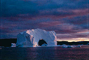 The ice-floe there produces more than 20 million tons of ice per day, which makes it by far the most productive ice-floe in the Northern hemisphere. The ice-front itself is some 45 kilometers inside Ilulissat Ice-fiord, where the glacier from the Greenland inland ice moves at a speed of 23 meters per day. The ice often starts it's journey with a thundering crash as it falls into the fiord. The huge icebergs are pushed by one another out through the fiord and right outside the town the largest of them get stuck on the sea bottom until the flood tide lifts them and sends them off to sea - on their final voyage.