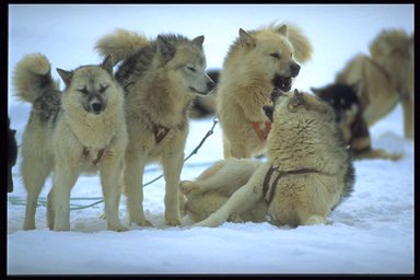 -The passenger sits at the back of the sledge, the driver sits at the front and steer the dogs.