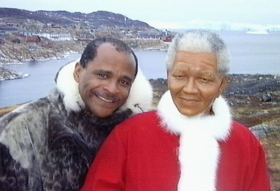 Mr. Lars Emil Johansen, prime minister of Greenland, together with full size statue of Nelson Mandela in Santa Claus dress (jpg-file, 48 kb)