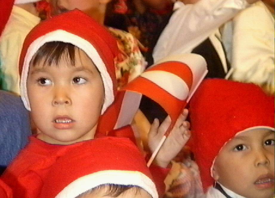 Inuit children with Santa hats and Greenlandic flags watching the Santa Games