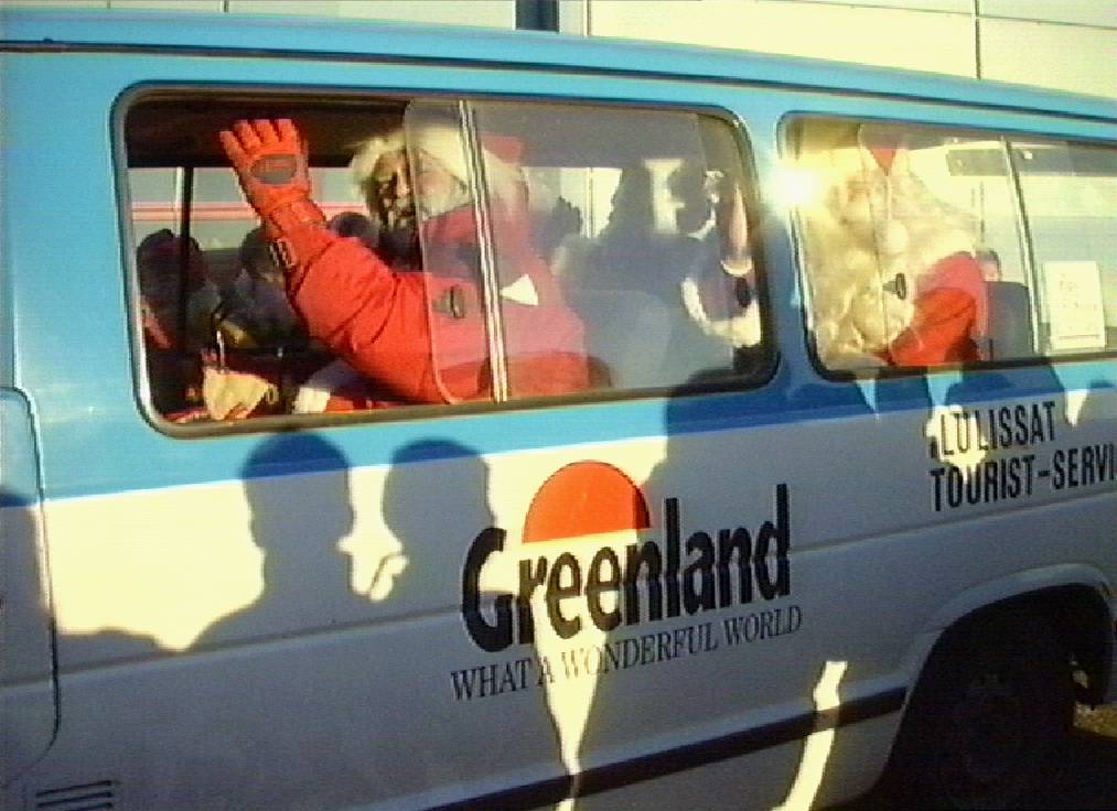 Santa's waving from the bus as they leave Ilulissat Airport