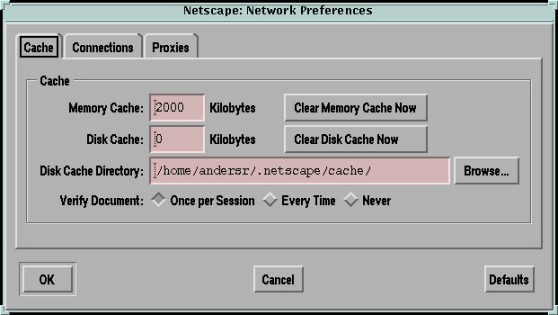 Netscape lagrar visade dokument i cacheminnet, för att snabbt kunna visa en sida igen. Det har dock den nackdelen att maskinens cacheminne snabbt förbrukas. Sätt Memory Cache och Disk Cache enligt bilden så elimineras problemet.