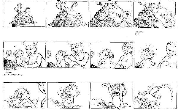 En story-board er en slags tegneserie, der fortæller historien i billeder. Story-board'en - på dansk dreje-bogen - laves når manuskriptet er færdigt. Man ved nu, hvilken historie man vil fortælle, men ikke præcist hvordan den skal fortælles. Hvilke billeder skal bruges? - det finder man ud af, når man tegner en story-board. På næste side er et eksempel på en story-board fra filmen. Som I kan se, har man brug for mange tegninger pr. scene. Det er nemlig vigtigt at vide nøjagtigt, hvilke bevægelser der senere skal animeres. Se forklaring på ordet animere længere fremme. Arbejd i par: fortæl din makker en kort historie om noget af det sjoveste/farligste/dejligste, du har oplevet. Få hende/ham til at tegne historien som story-board. Ser historien ud, som du oplevede den? Byt roller, så I begge prøver at fortælle og tegne. Hvad tror I en story-board skal bruges til? Og hvem tror I skal bruge den?