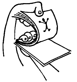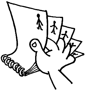 skal I ringe til BIF, hvis I ikke kan finde svarene andre steder. God fornøjelse Susanne Wad Hvad er animation?Tegnefilm er ikke kun for børn. Når tegnefilmfigurer har fans i alle aldre og på tværs af kloden er det fordi, der er noget universelt menneskeligt over dem, vi kan identificere os med dem. Almindelige film bærer tydeligt præg af den periode, de er producerede i, og vil ofte hurtigt blive uaktuelle. Tegnefilm vil derimod ofte være tidløse, fordi de skaber deres eget univers. At animere betyder at besjæle. I animationsfilmen giver man liv - man besjæler - ellers døde objekter, det være sig tegnede figurer, dukker eller andre genstande. Men princippet - teknikken - er den samme som i almindelige spillefilm: for at billederne skal blive "levende" vises 24 enkeltbilleder pr. sekund. Ved animation optages et billede ad gangen, hvorefter tegningen ændres. Som ved alle andre "levende" billeder er teknikken baseret på den træghed i menneskets øje, der gør, at man ikke registrerer de hurtigt skiftende billeder. Hjernen bevarer billedet lidt længere, end det i virkeligheden bliver vist. Denne opdagelse gjorde man allerede i filmens barndom, og de første film er da også baseret på dette fænomen. Man har fundet frem til, at en optage/forevisnings frekvens på 24 billeder pr. sekund er optimal til at skabe illusionen af "liv" på lærredet. Animationsfilmen anvender samme grundlæggende fortælleredskaber som den almindelige film. Det man præsenteres for, når man ser en tegnefilm, er en fortælling komponeret af en række scener/begivenheder, skildret gennem skiftende billedkompositioner (totalbilleder, nærbilleder osv.) og tilsat lyd i form af tale, musik og lydeffekter. Men animationsfilmen er noget særligt. I animationens univers er det kun fantasien, der sætter grænser for fortællingen. Det er en fast regel for denne genre at bryde naturlovene: Tyngdekraften og grænser for fysisk udfoldelse findes ikke. Og dyr har - sammen med fantasifostrer og andre skabninger - hovedrollerne. Animationsfilmen har nogle muligheder, den almindelige film ikke har. Man har blandt andet mulighed for at anvende farver, lys og symboler mere ekstremt, til at understrege figurernes personlighed, til at underbygge stemninger til at markere tidspunkter på dagen eller lignende. Hvem kan for eksempel forestille sig, at hovedpersonen i en almindelig spillefilm i bogstaveligste forstand bliver lilla i hovedet af raseri? Gå selv i gang1) Animation uden kameraDen mest simple animationsteknik er "flippe"-metoden. Her lærer man at få en tegning til at bevæge sig uden at optage med kamera. Øvelsen er god i et kortere undervisningsforløb, eller hvis man er et stort hold, der ikke har mulighed for at dele sig i mindre grupper. "Flippe"-animation kan udføres af eleverne enkeltvis eller i par og kræver kun kort introduktion fra læreren. Man kan "flippe" på tre forskellige måder. Det vil være en god idé, at man forsøger sig med alle tre. Begynd med teknik 1, og følg udviklingen til de lidt mere krævende: teknik 2 og 3. Flippe teknik 1Eleverne folder et A4-ark og lægger det på bordet med den foldede kant mod dem selv. De tegner en figur på den nederste side, f.eks. en tændstikmand med arme og ben strakt ud til siderne i sprællemandsstilling. Så tegner de den samme mand, som nu står ret, med arme og ben ind til kroppen. Hvis de bruger den nederste tegning, der kan anes gennem papiret, som skitse, sikrer de at proportionerne bliver ens, og figuren bliver stående på samme sted. I stedet for en tændstikmand kan man f.eks. tegne en fugl, der bevæger vingerne op og ned, et ansigt som skiftevis smiler og er neutralt eller noget andet. Ved at bladre hurtigt frem og tilbage mellem de to sider, vil man se tændstikmanden sprælle, ansigtet ændre sig osv.. Det, der blot er et skift mellem to forskellige tegninger, virker nu som en bevægelse. Flippe teknik 2Eleverne får hver en lille blok og vender den på hovedet, så blokkens ryg vender mod dem selv. De bruger nu de fem bageste sider til at tegne en figur, der bevæger sig. Tegning nr. 1 på det nederste ark. Bevægelsen fortsætter på de fire næste ark - princippet er det samme som Flippe-teknik 1, her får man blot flere detaljer med. Husk at tegningen nedenunder skal bruges som skitse! Man stikker nu en finger mellem hvert ark, og flipper dem frem og tilbage - ét ad gangen. Det kræver en smule øvelse, men prøv jer frem - først langsomt, så hurtigt. Når eleverne har lært teknikken, vil de opleve at figuren bevæger sig glidende. Flippe teknik 3Eleverne får en stak papirer eller en blok og tegner en masse animationstegninger - på samme måde som før, blot med flere tegninger. Husk hele tiden at kigge på den nederste tegning, så figuren holder proportionerne! Her har man mulighed for at lave andet end én simpel bevægelse. Prøv f.eks. at tegne en mand, som går tur i stormfuldt vejr. Han kæmper sig frem, bladene fyger ham om ørerne, og til sidst kan han ikke stå fast - han blæser til vejrs! (Find selv på andre historier). Man letter på tommelfingeren (se illustrationen) og bladrer papirerne hurtigt igennem. Find en hastighed, der er passende. Tag tid med et stop-ur eller sekundviser. Hvor lang er "filmen" og hvor mange tegninger er der? Hvor mange tegninger svarer det til i sekundet, og hvordan er det i forhold til "rigtig" tegnefilm? 2) Tegneserier, dias og simple forsøg med animationTegneserie/story-board Eleverne laver en tegneserie eller en story-board, men de skal først finde ud af, hvilken historie de vil fortælle. Lav f.eks. grupper på 3-5 elever, som kan tale sammen om idéerne. Når de er blevet enige om en historie, kan de skrive handlingen med ord. Når alle grupper er færdige, vil det være en god idé at fremlægge historierne for klassen og give hinanden gode råd. Hvilke figurer er med i historien? Eleverne laver et figurdesign, hvor de beslutter, hvordan de forskellige figurer skal s