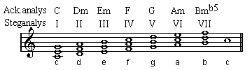| Så blir de övriga treklangerna i C-dur. Jämför ackordsanalys och steganalys. (Den 7:e klangen låter ganska konstig och är inte så användbar.) | |