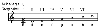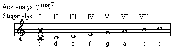 TreklangerOm man bildar en treklang från C-durskalans första ton får man ett C-durackord. Det kallas den 1:a klangen och skrivs med romerska bokstäver = I. | |