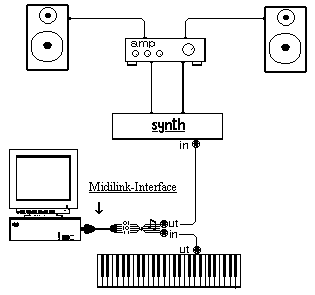- Med en midikabel kopplar man ihop midilink-interfacets "midi ut" med ljudsynthens "midi in"