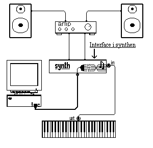 - Med en midikabel kopplar man ihop ljudsynthens"midi in" med klaviaturets "midi ut".
