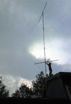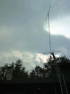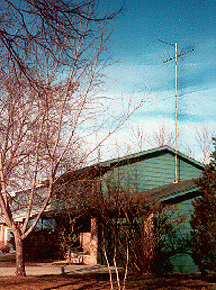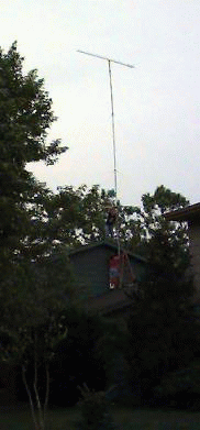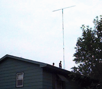 On July 3rd, 1995, Joe Metzger and Stehpen Elbert spent the afternoon taking down a 6' antenna and replacing it with a 12' one. Reason being: our wireless ethernet connection wasn't holding up its reputation as fast and powerful...in fact, nothing was getting through at all. Since this kind of setup is relatively new in Ames, Iowa, we weren't altogether sure what was causing the loss of transmission. We reasoned that there was probably too much foliage blocking the transmission between our house and the receiving antenna at Ames Lab, and the fact that we live low in a valley doesn't really help. However, the larger antenna, which is about 10 feet higher than the previous one, helped significantly! I don't know how much fun it was putting the monstrous thing up, as I stayed safely on the ground pretty much the whole time, but I certainly had fun taking pictures with our new Apple QuickTake 150 digital camera! And here you can see what I ended up with, as well as the dramatic happenings that took place that day. :-)