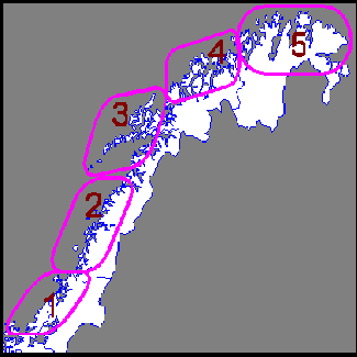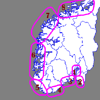 [1. Indre Oslofjord] [2. Oslofjord Øst] [3. Oslofjord Vest] [4. Sørlandet Øst] [5. Sørlandet Vest] [6. Vestlandet Syd] [7. Vestlandet Nord] [8. Sør Trøndelag] |
