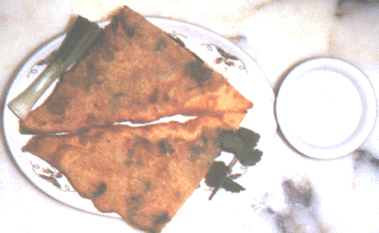 Either potato or scanllion turnover serverd with either or hot Chatnee.