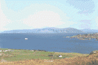 A pale velvet vista beckoned us. Ben More, the highest mountain on Mull, had broken free of its tether of clouds and Mull's rugged coastline looked like a faded but precious tapestry. Sprawled out below us were the crofts and beaches that lie at the north end, white sands draped like creamy taffeta around the emerald pastures. We could hardly see the sheep grazing there, but we could hear them, gossiping ever so quietly between dainty nips at the turf.