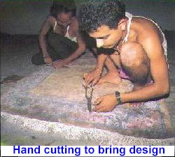 Hand knotted Woollen carpets when finished in the loom are taken out and Hand cut to bring out designs contained in the weaving.