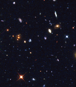 Disse optagelser fra Rumteleskopet viser en galaksehob, indeholdende et væld af forskellige typer galakser, som er så langt borte, at vi her betragter universet, da det kun havde en brøkdel af dets nuværende alder. Billederne krævede næsten 24 timers eksponeringstid. Lyset fra galakserne er fire milliarder gange svagere, end hvad det blotte øje kan se, eller hvad der svarer til 30. størrelsesklasse. Billedet til højre dækker et område på himlen, svarende til cirka 1/10 af fuldmånens diameter. De lyse, blå regioner er områder, hvor der finder aktiv stjernedannelse sted. Rumteleskopets observationer viser, at disse områder engang var langt mere talstærke end store galakser som vores egen Mælkevej. Optagelserne er et led i en gennemgribende kortlægning af himlen. Projektet er gennem 3 år blevet ledet af professor Richard Griffiths fra Johns Hopkins University i Baltimore, USA, i samarbejde med andre astronomer fra USA og Storbritannien. Kortlægningen er én af Rumteleskopets hovedopgaver. Den har afsløret et væld af forskellige former og strukturer i fjerne galakser. Inden Hubble blev opsendt, kunne disse kun observeres som tågede strukturer fra jordbaserede teleskoper.