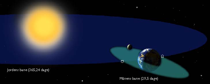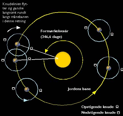 Månens baneplan hælder 5° i forhold til Jordens baneplan (ekliptika), og det er den egentlige årsag til, at der ikke er solformørkelse ved hver nymåne. I den ene halvdel af måneomløbet befinder Månen sig over ekliptika, og i den anden halvdel er Månen under ekliptika. De to symboler markerer månebanens skæring med ekliptika.
