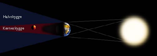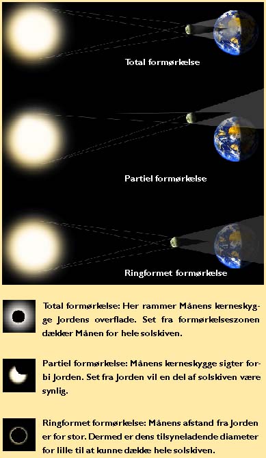 Solformørkelsen er kun total, når selve den kegleformede kerneskygge rammer Jorden. Under en partiel formørkelse er det kun den omgivende halvskygge, der rammer Jorden. I dette tilfælde passerer kerneskyggen enten lige over Jordens nordpol eller lige under Jordens sydpol. Den partielle formørkelse kan derefter ses fra den del af kloden, der ligger nær ved det pågældende nord- eller sydpolsområde. Man skelner således mellem 3 forskellige typer af solformørkelser, som er illustreret herover. Læs i "AKTUEL ASTRONOMI", efterår 1996, nr. 4 mere om, hvordan man kan beregne, hvornår de næste solformørkelser indtræffer.
