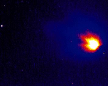 Hale-Bopp observeret med Astronomisk Observatoriums 50 cm Schmidt teleskop i Brorfelde. Optagelsen er lavet i diset vejr lige efter solnedgang den 24/11 i synligt lys med en eksponeringstid på 100 sek.