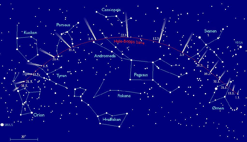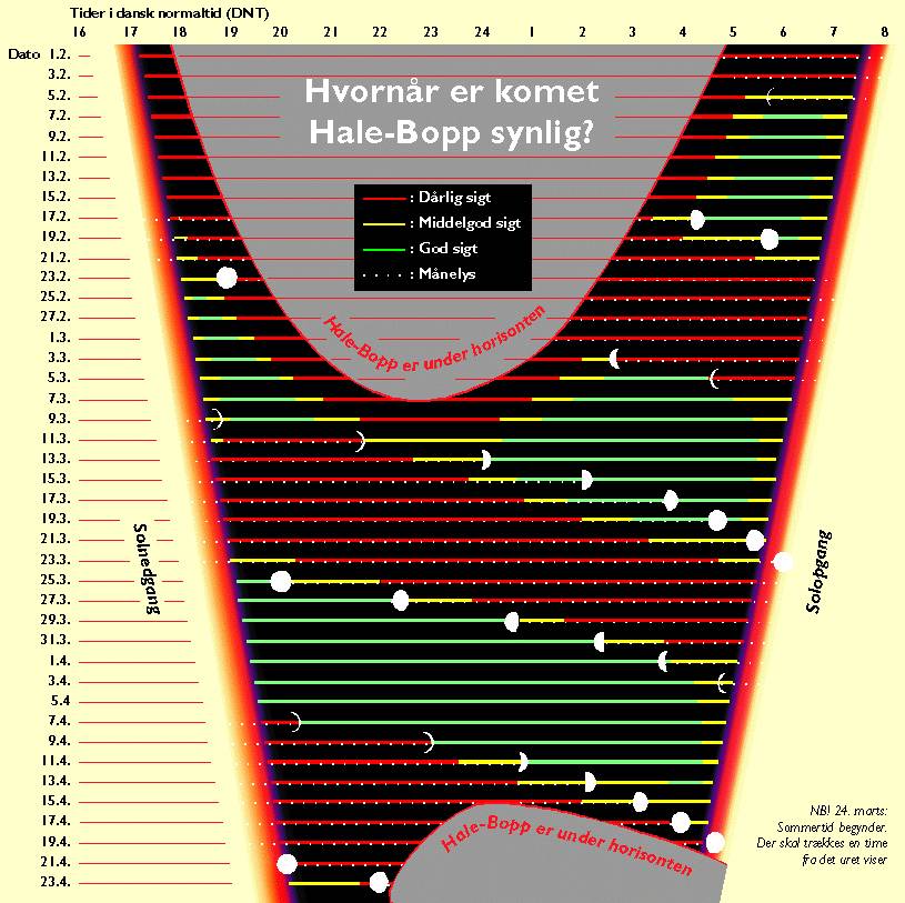 Ligesom det var tilfældet med komet Hyakutake, vil også Hale-Bopp til den tid være synlig i en længere periode i døgnets mørkeste timer omkring midnat.