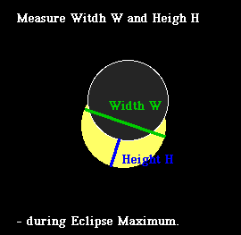 If you choose to use the 2-dimensional method for the partial eclipse on October 12, 1996, you should follow the eclipse as long as practically feasible. Make continuous measurements of both the Width W and the Height H, as these are indicated in the figure below: