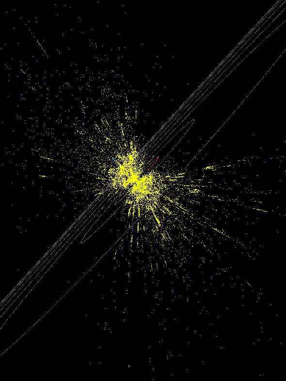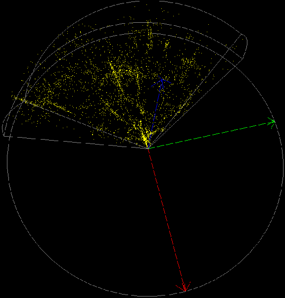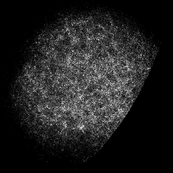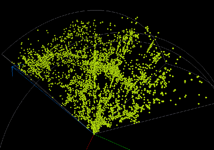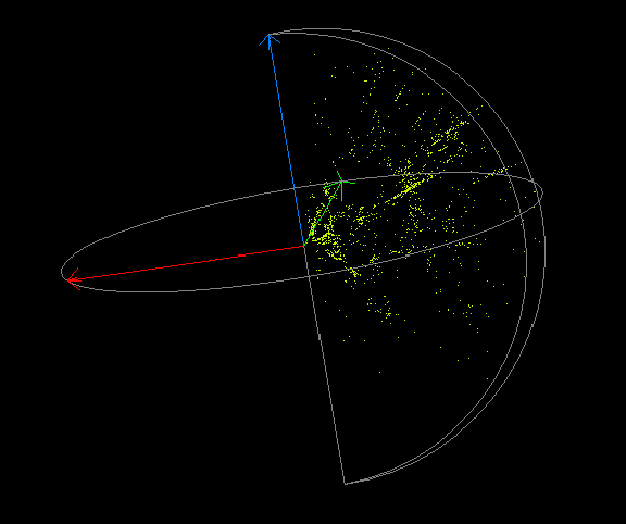This is the wellknown northern CfA slice. Seen from this angle, it looks almost like a traditional 2D plot. Another look at this slice:Here we reproduce the galaxies as polygons (spheres). Is is easier to grasp the subtle 3D structure in this way, but the CPU load gets at least two orders of magnitude larger.The sampled section in the two snapshots is 8h <= alpha <= 17h, 8.5 deg. <= delta <= 44.5 deg., and z < 0.04. If we make a thinner slice in declination, like this, we reduce contamination of the structure due to projections.