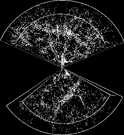 The picture on top of the page is a 15 degree slice of a sample of the CfA Catalogue ranging to $z=0.04$. This image is a snapshot from a animation made by means of IDL.