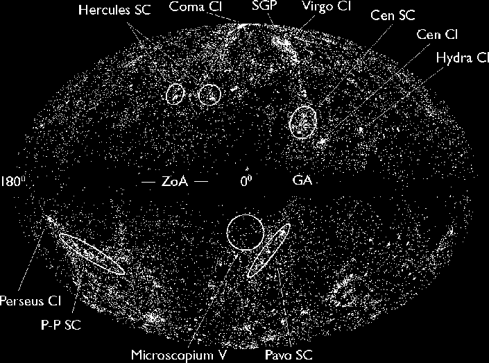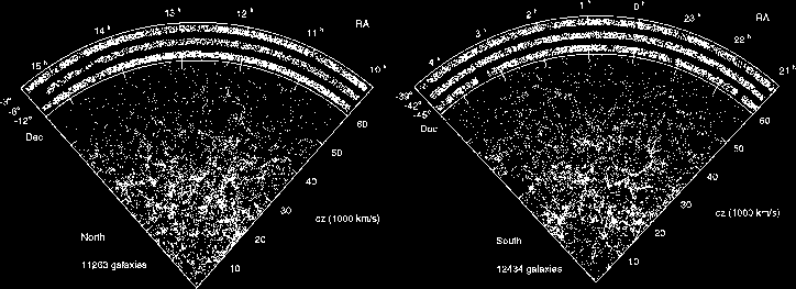 Here is the angular distribution of the large sample of galaxy redshifts. It shows a very nice view of the large scale structures we know of in our "neighbourhood".