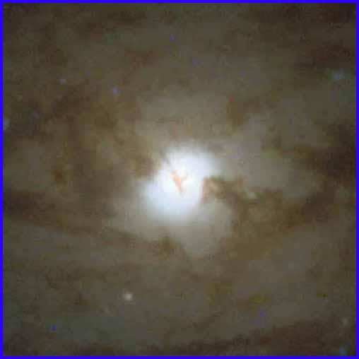 Det mørke Y tværs over galaksens centrum er formentlig absorberende støv. Det lyse område i Y'ets midte har en lysstyrke på én million gange Solens, men er mindre end 5 lysår i diameter. Denne voldsomme lysstyrke sammenholdt med den lille udstrækning tyder på, at vi observerer det aktive område omkring selve galaksecentret, der formentlig indeholder et massivt sort hul. Energiudvekslingen her producerer meget kraftige radiojets.