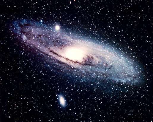 Andromedagalaksen, M31 er tydeligvis en spiralgalakse. Måske ville Mælkevejen ses således ud hvis vi kunne se den udefra. Vi ser bulen samt de lange støvbånd, der løber langs spiralarmene. To elliptiske satellitgalakser til M31 ses også