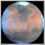 Because it is spring in Mars' northern hemisphere, much of the carbon dioxide frost around the permanent water-ice cap has sublimated, and the cap has receded to its core of solid water-ice several hundred miles across. The abundance of wispy white clouds indicates that the atmosphere is cooler than seen by visiting space probes in the 1970s. Morning clouds appear along the planet's western (left) limb. These form overnight when Martian temperatures plunge and water in the atmosphere freezes out to form ice-crystal clouds. Towering 25 kilometers (16 miles) above the surrounding plains, volcano Ascraeus Mons pokes above the cloud deck near the western or limb. Valles Marineris is in the lower left. (Credit: Philip James, University of Toledo; Steven Lee, University of Colorado; and NASA)