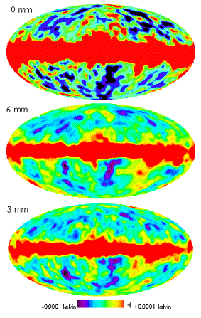 De tre mikrobølgekort over himlen viser målingerne i tre frekvensbånd, svarende til bølgelængderne (fra oven) 10, 6 og 3 mm. Den markante, vandrette røde plamage skyldes vores Mælkevej og er i denne forbindelse en uønsket "forurening", som forskerne må fjerne på snedig vis. Det kosmiske signal er synligt som de få, blå og røde pletter, der går igen i de tre billeder.