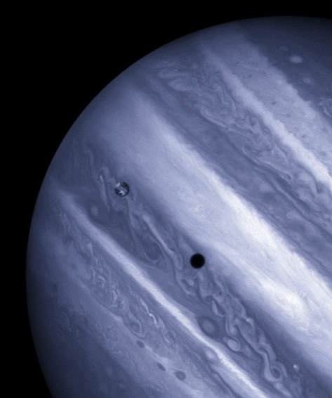 Billedet viser den vulkansk aktive måne Io over Jupiters turbulente skyformationer. Den sorte plet på Jupiters skylag er skyggen fra Io, som bevæger sig hen over planetens overflade med en hastighed på 17 km pr. sekund.
