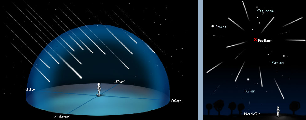 Herfra stråler de ud i alle retninger - som eger i et cykelhjul. Det er dog kun en perspektivisk oplevelse af en stor mængde stjerneskud, der følges ad parallelt ned gennem atmosfæren. Radiantens placering på himlen i et stjernebillede giver normalt sværmen dens tilhørende navn. Perseidernes radiant ligger således i stjernebilledet Perseus.