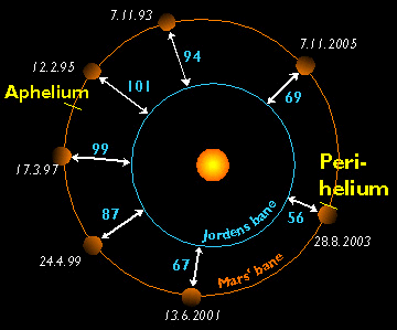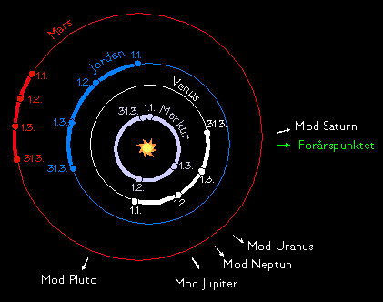 Mars er faktisk først nærmest Jorden nogle dage senere, nemlig den 20. marts, hvor afstanden kl. 18 er 98,6 millioner km, og her opnås derfor også den maksimale lysstyrke og tilsyneladende diameter.