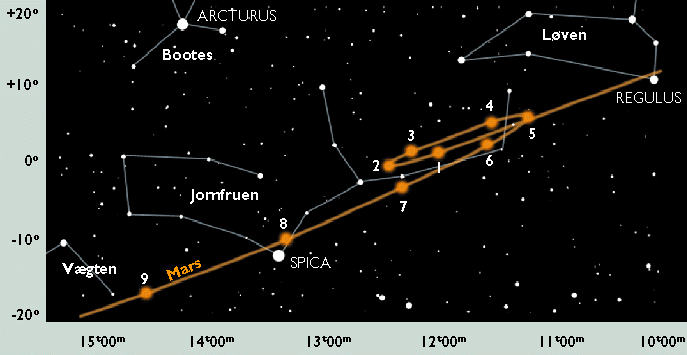 I marts kan vi fortsat finde Mars i retrograd bevægelse i stjernebilledet Jomfruen. Planeten er i opposition den 17. kl. 9 og befinder sig da i præcis modsat retning af Solen. Den vil derfor kulminere ved midnat og være synlig hele natten.