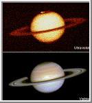 For comparison, the bottom image is a visible-light color composite of Saturn as seen by Hubble on December 1, 1994. Unlike the ultraviolet image, Saturn's familiar atmospheric belts and zones are clearly seen. The lower cloud deck is not visible at UV wavelengths because sunlight is reflected from higher in the atmosphere.