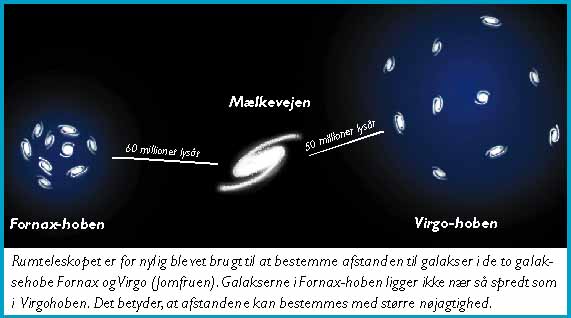 Hovedårsagen til overvindelsen af vanskelighederne ligger mere præcist i, at det nu har været muligt at bestemme den nøjagtige afstand til en række galakser i den såkaldte Fornax-hob. Dens medlemmer ligger meget tættere samlet end de tilsvarende galakser i Jomfru-hoben, en anden betydningsfuld galaksehob i jagten på universets udvidelseshastighed. Og det betyder, at unøjagtighederne i afstandsbestemmelserne for galakserne i Fornax-hoben er tilsvarende mindre. Ganske enkelt fordi de ligger mindre spredt. Selv om man ikke ved, nøjagtig hvor langt en galakse befinder sig fra hobens centrum, så betyder den uvished jo ikke så meget, når selve hobens udstrækning i rummet er forholdvis lille Alt i alt har det betydet, at der nu kun er omtrent 25 procents forskel på de to gruppers værdier for universets udvidelseshastighed. Det er så lille en forskel, at Rumteleskopets astronomer i en nylig pressemeddelelse ikke tøver med at fastslå, at de regner med, at de to gruppers resultater vil fortsætte med at mødes mod hinanden, når flere resultater indløber. Lige nu er forskerne omtrent halvvejs i et storstilet 3-årigt program, der går ud på at få bestemt nøjagtige afstande og flugthastigheder for 25 galakser i Fornax-hoben.