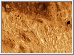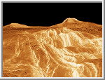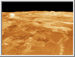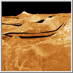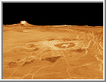 Venus is scarred by numerous impact craters distrubuted randomly over its surface. Small craters less that 2 kilometers (1.2 miles) are almost non-existent due to the heavy Venusian atmosphere. The exception occurs when large meteorites shatter just before impact, creating crater clusters. Volcanoes and volcanic features are even more numerous. At least 85% of the Venusian surface is covered with volcanic rock. Hugh lava flows, extending for hundreds of kilometers, have flooded the lowlands creating vast plains. More than 100,000 small shield volcanoes dot the surface along with hundreds of large volcanos. Flows from volcanos have produced long sinuous channels extending for hundreds of kilometers, with one extending nearly 7,000 kilometers (4,300 miles).